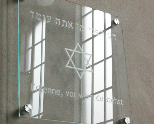 Bild rechts: „Erkenne, vor wem Du stehst“, mahnt die Gedenktafel an der Wand, an der einst der Toraschrein stand. Der Satz stammt aus der Mischna, einer Niederschrift der „mündlichen Tora“.