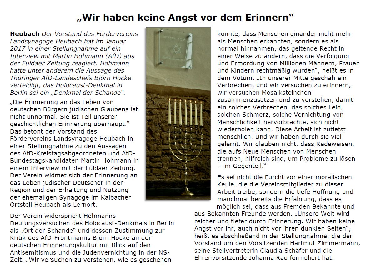 Das Interview mit Martin Hohmann (AfD) erschien am 21. Januar 2017 in der „Fuldaer Zeitung“ > zum Zeitungsartikel. Der Förderverein widersprach dem AfD-Mann mit dieser Stellungnahme