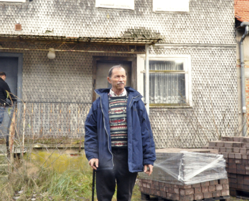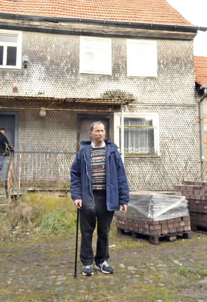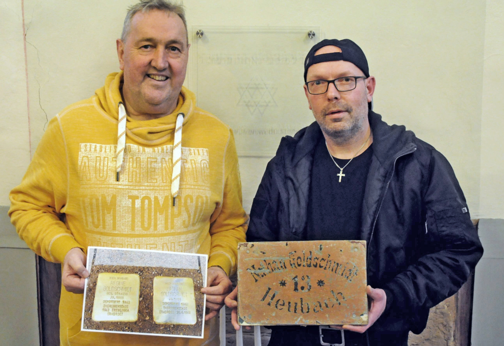 Gemeinsam werden im Dezember 2013 zwei jüdische Besucher und ein Heubacher mit einer Säge an einem Türpfosten eines einst jüdischen Hauses in Heubach aktiv: Michael Goldschmdt (72) und sein Sohn Chaggai besuchen das Elternhaus von Michaels Großvater Simon Goldschmidt, heute Friedensstraße 20. Nach alter Zählung war es das Haus Nr. 48 – und dort wohnte der letzte Vorsteher der Heubacher Judengemeinde. Simon Goldschmidt war es seinerzeit gewesen, der die Auflösung der überalterten jüdischen Gemeinde vollzog. Und er regelte auch den Verkauf des einstigen Synagogengebäudes an das Dorf Heubach.