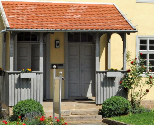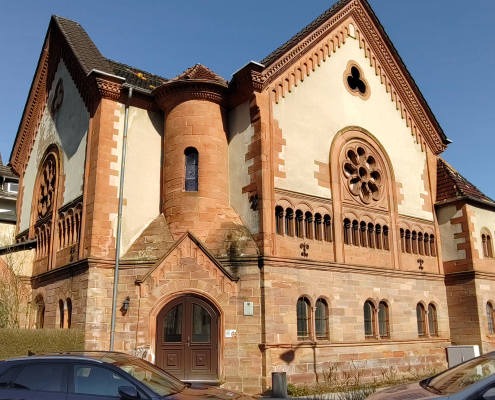 Das Bauvorhaben der Gemeinde zeugt durchaus von Selbstbewusstsein: Sie erwarb das im Ortskern gelegene Grundstück der einstigen Zehntscheune und ließ dort – ausgeführt von christlichen Handwerkern – 1843 ein stattliches Fachwerkhaus errichten. Angesichts der vielfältigen Nutzung würde man heute wohl von einem „Gemeindezentrum“ sprechen. Denn das Gebäude mit dem markanten Doppel-Eingang beherbergte in der rechten Hälfte den die doppelte Geschosshöhe einnehmenden Synagogenraum. Über den linken Eingang gelangte man zur Frauenempore. Aber er führte auch zur Wohnung des Lehrers, zum Schulraum und zum Ritualbad, der Mikwe.